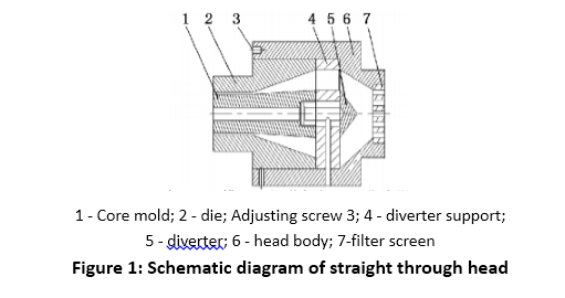 डोके हे साधारणपणे हेड बॉडी, डायव्हर्टर, डायव्हर्टर सपोर्ट, ॲडजस्टिंग स्क्रू, कोअर डाय, डाय लिप इत्यादींनी बनलेले असते.पाईप एक्सट्रूजन हेडसाधारणपणे सरळ प्रकार, काटकोन प्रकार, विक्षिप्त प्रकार, सर्पिल प्रकार आणि स्क्रीन बास्केट प्रकारात विभागले जातात. स्ट्रेट थ्रू हेड हे सर्वात जास्त वापरले जाते आणि त्याची रचना आकृती 1 मध्ये दर्शविली आहे. डोके खालील तीन भागांमध्ये विभागले जाऊ शकते: डोकेचे शरीर आणि डायव्हर्टर हे डोकेचा पहिला भाग बनतात, म्हणजेच प्रीफॉर्म विभाग; डायव्हर्टर सपोर्ट, डाय आणि कोरचा कम्प्रेशन सेक्शन डोकेचा दुसरा भाग बनवतो, म्हणजेच कॉम्प्रेशन सेक्शन; डाय आणि कोअरचे सरळ विभाग डोकेचा तिसरा भाग बनवतात, म्हणजेच फॉर्मिंग सेक्शन.